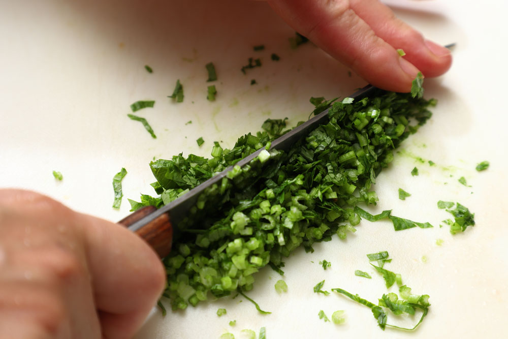 香菜の茎と葉を細かく刻む。香菜は水分が出にくいので、写真のように何度も包丁を動かし刻んでOK。