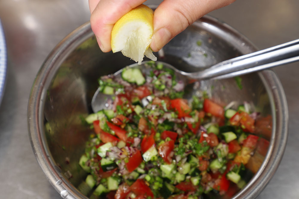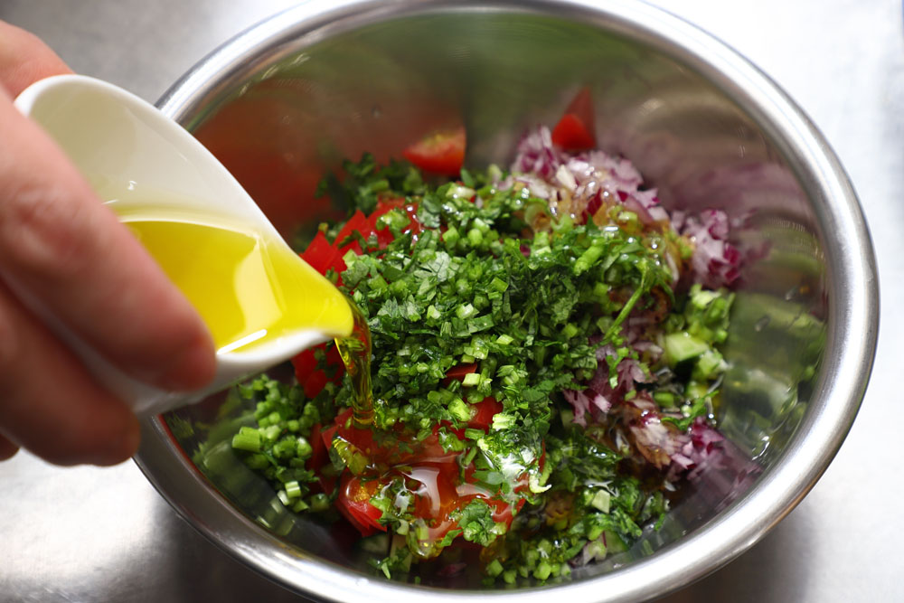 全てを刻んだら、最初にオリーブ油で和えましょう。野菜の表面をコーティングすることで、塩やレモン汁の刺激から野菜を守り、水が出にくくなります。