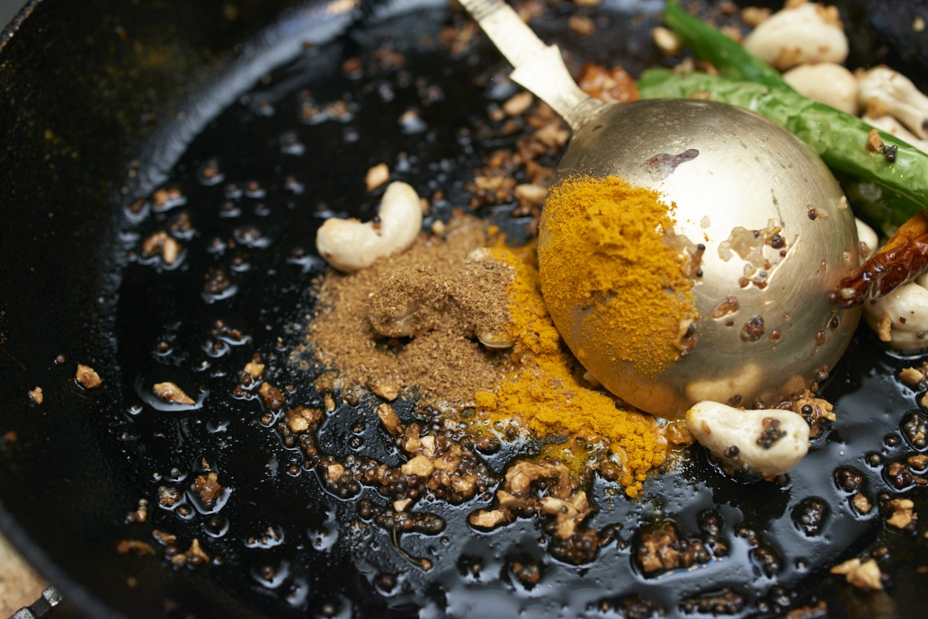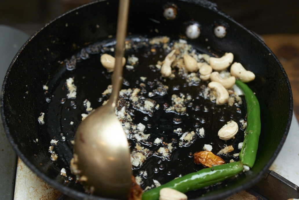 鍋に油を引き、ホールスパイスを入れてマスタードが弾けるまで揚げるように炒める。青唐辛子、ショウガ、ニンニク、カシューナッツを炒め合わせる。