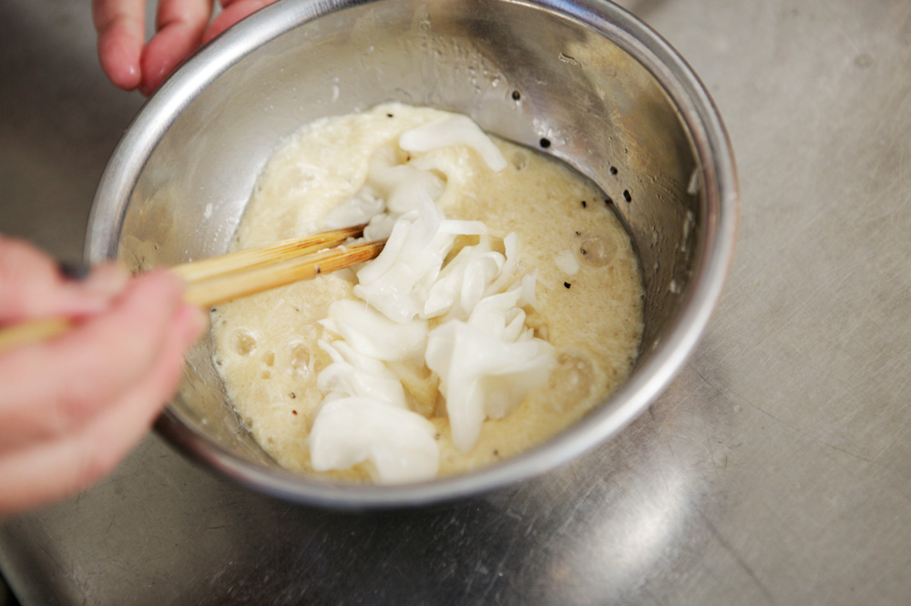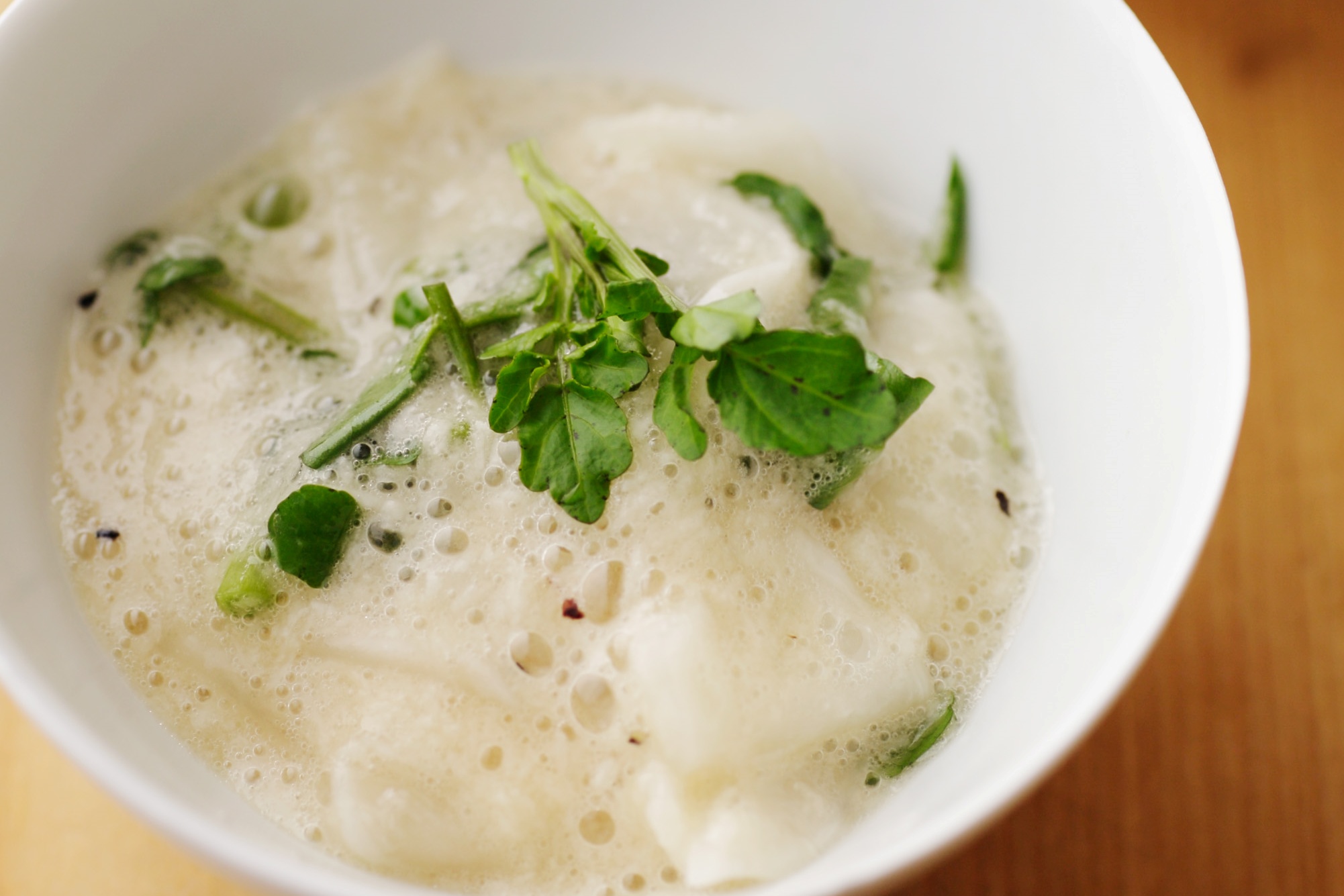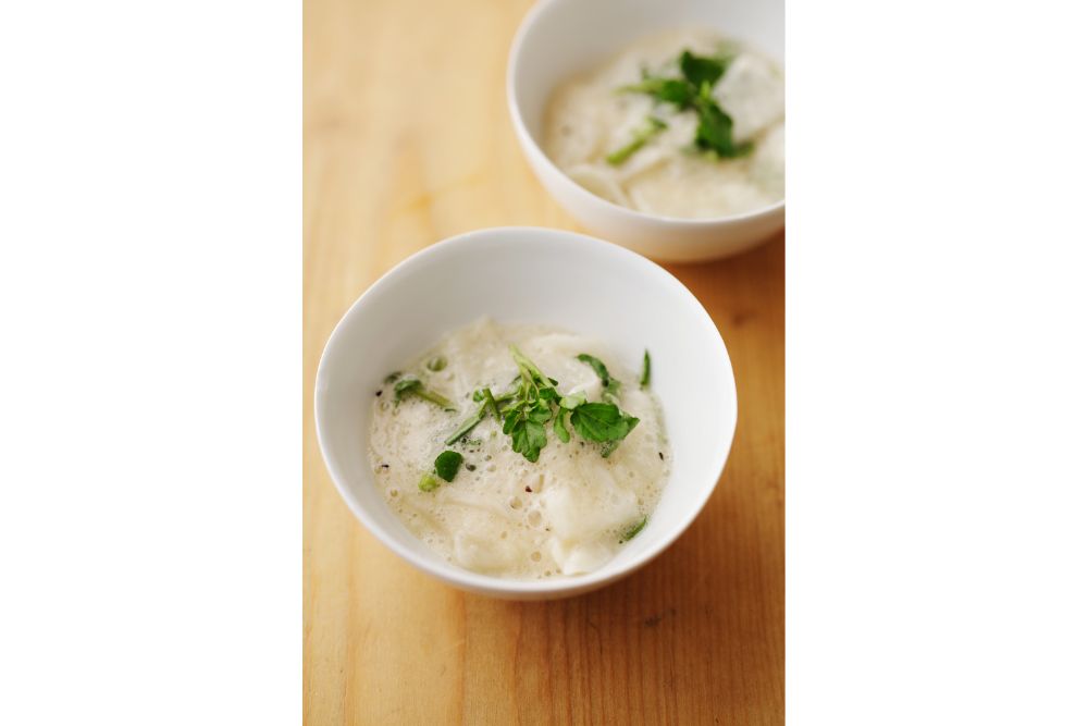 「ズズズのサラダ」の完成。ネーミングの妙にまず拍手。だしがベースのしっかりめの味つけ。野菜同士の組み合わせで味をまとめます。カブとクレソンの代わりに、エシャロット(4~5㎝の長さの薄切り)とピーマン(繊維を絶つようにスライスし、軽く湯通しして氷水につけて水気を切る)を和えても美味。ズズズとすすってどうぞ。