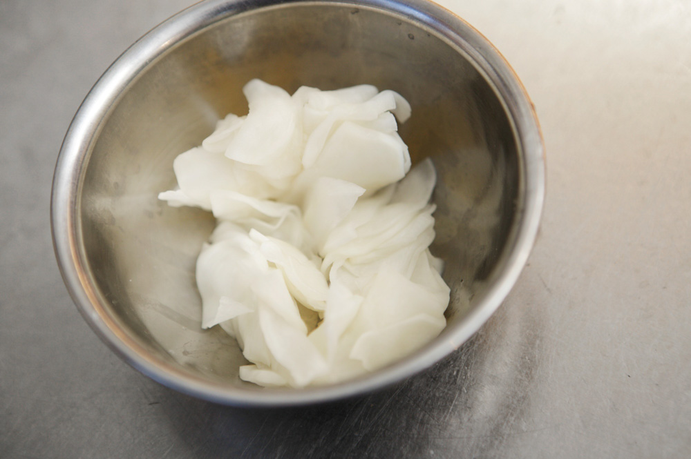カブは皮を剥き、一口大の薄切りにする。小さなボウルに入れ、軽く塩をしてしんなりさせる。