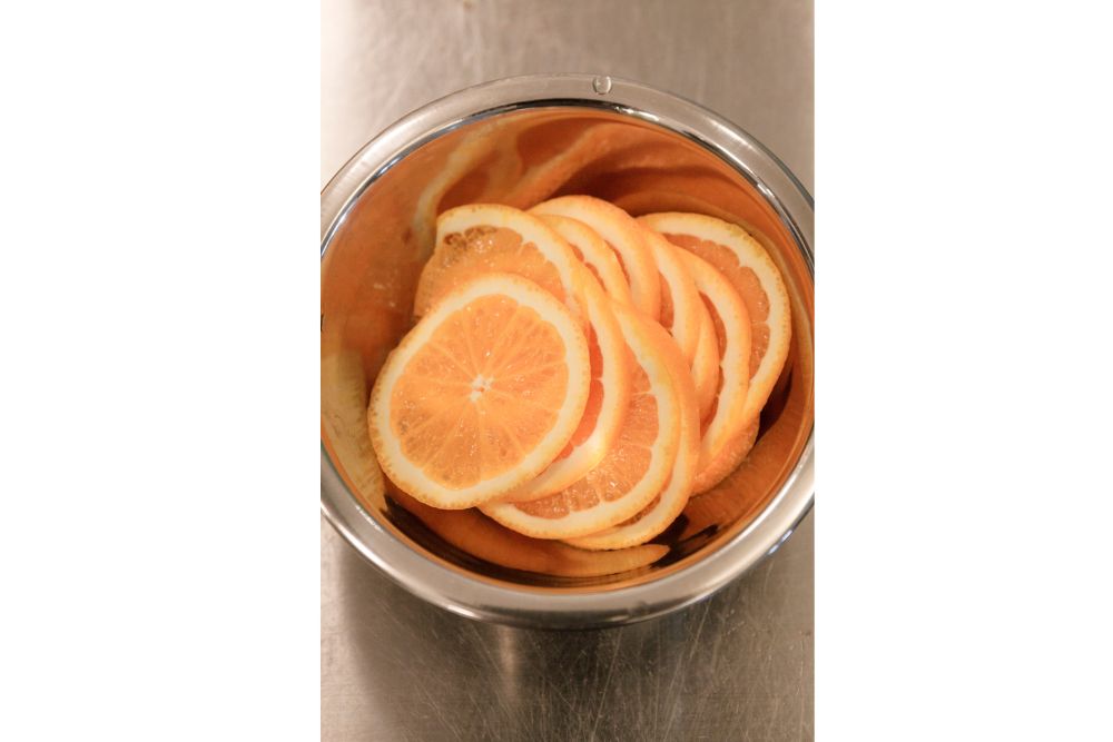 オレンジは皮付きのまま4~5㎜厚さの輪切りにする。
