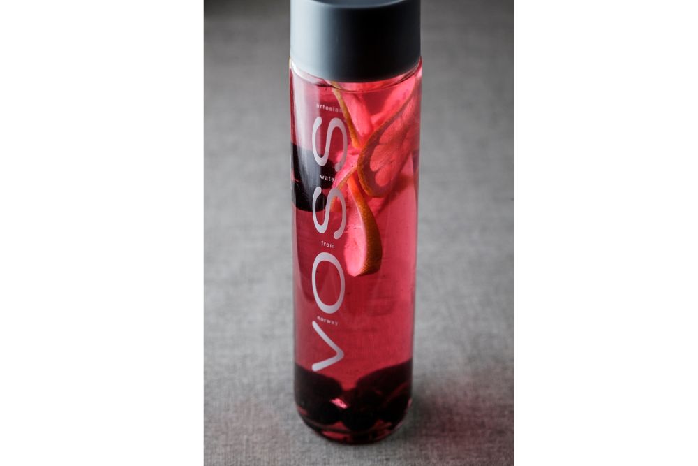 冷凍のベリーは水に浸けるとすぐに愛らしいピンク色が溶け出してくる。蓋付きのミネラルウォーターのボトルに加えれば持ち歩きもできて、いつでもデトックスウォーターを楽しめる。