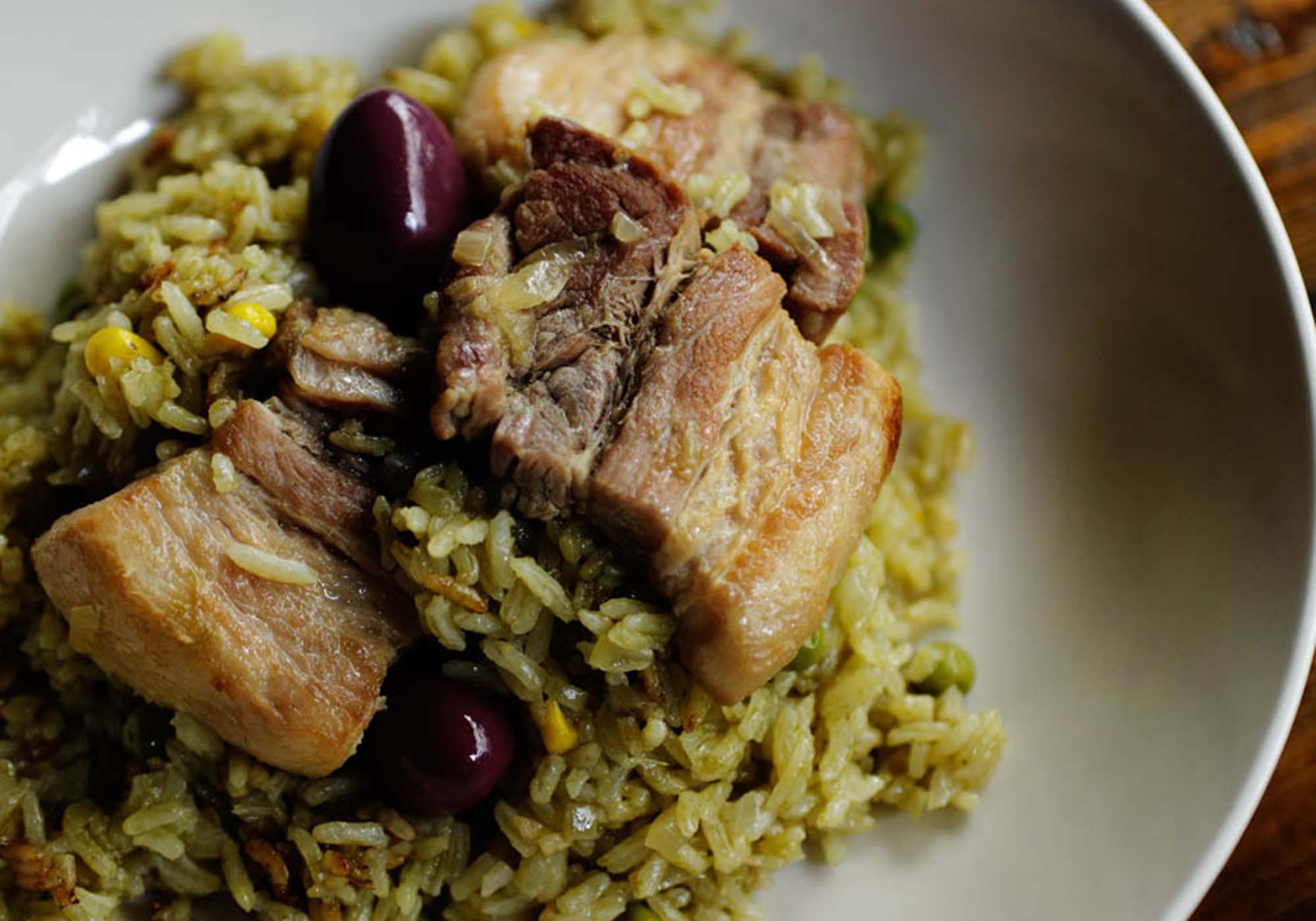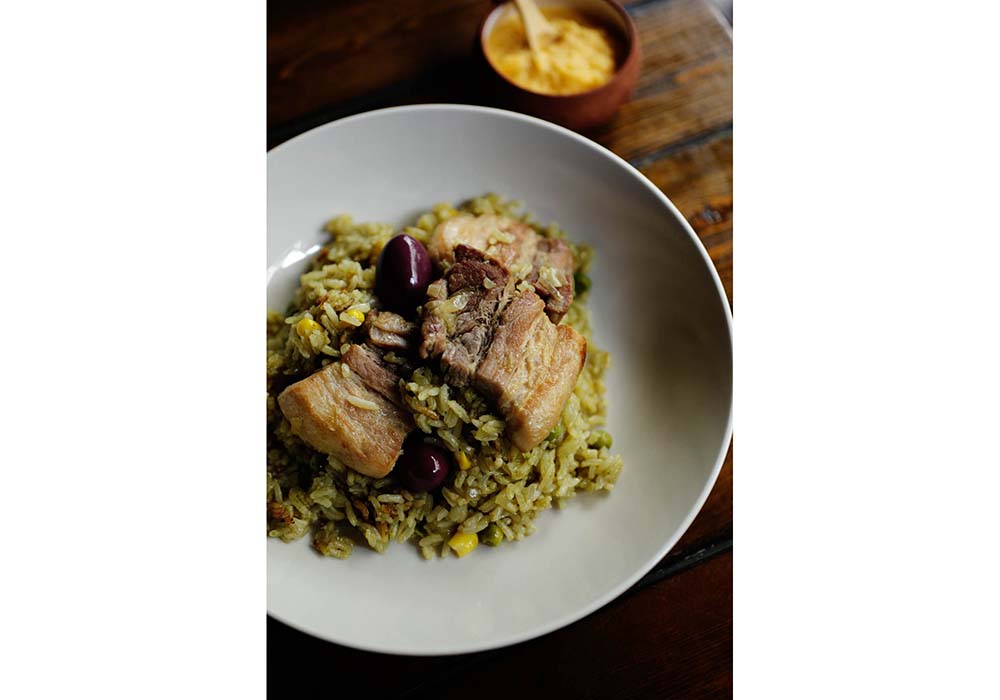 ぐっと濃いコクのある豚バラ肉の旨味、穏やかながら後追いでじわじわくる辛味。ペルー仕立ての炊き込みご飯「アロス・コン・チャンチョ」は和食のようなほっとする味ではなく、ボリュームのある骨太な味わいが魅力です。