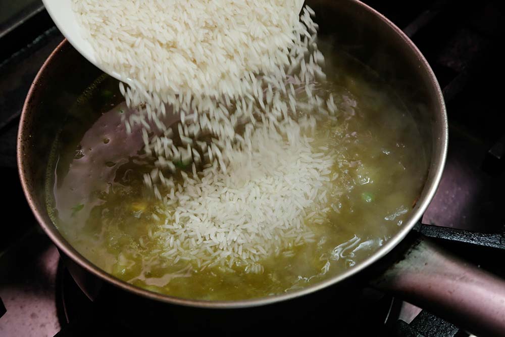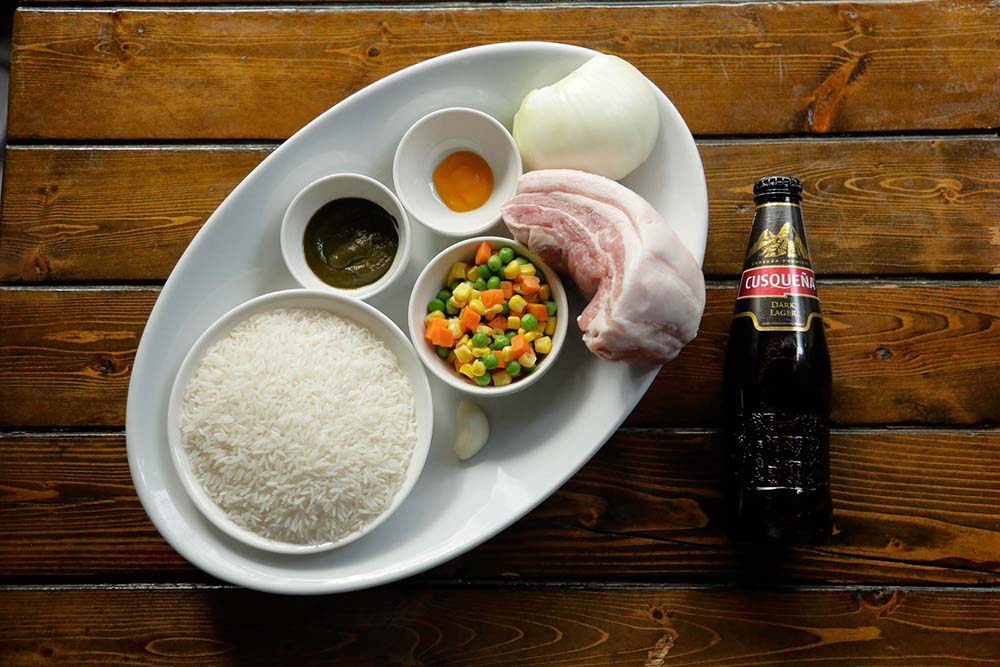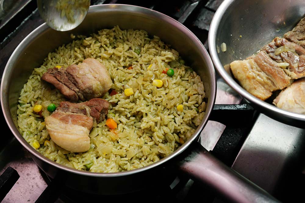 ぺルーは日本と同じ米食文化。肉や魚介を具にする炊き込みご飯は多く、豚、鶏、鴨などいろんなバージョンがあります。肉によって味付けを変えますが、豚バラ肉の場合は、甘くこっくりした脂身の旨味とバランスをとって、刺すような鋭い辛味でなく、後から静かにくる辛味をメインにします。今回はアヒアマリージョという黄色い唐辛子を使いました。最初はマイルドですが、後からじわじわ増す辛味が豚バラ肉と相性がいい。加熱すると辛味が増すので、最初にニンニクと一緒に炒めます。