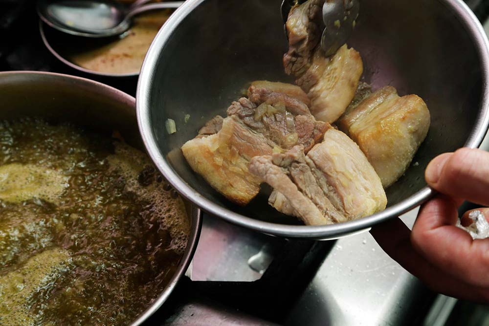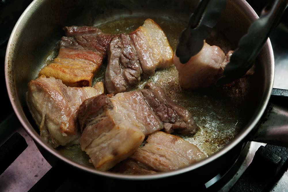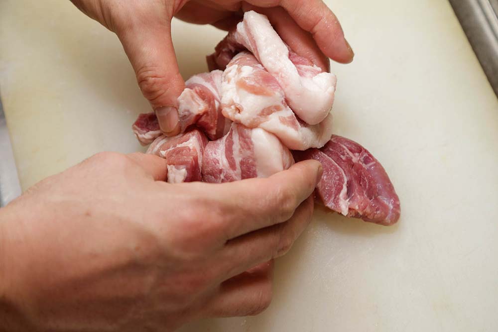POINT: 豚バラ肉は脂身と赤身が両方バランス良く入ったものを選ぶ。