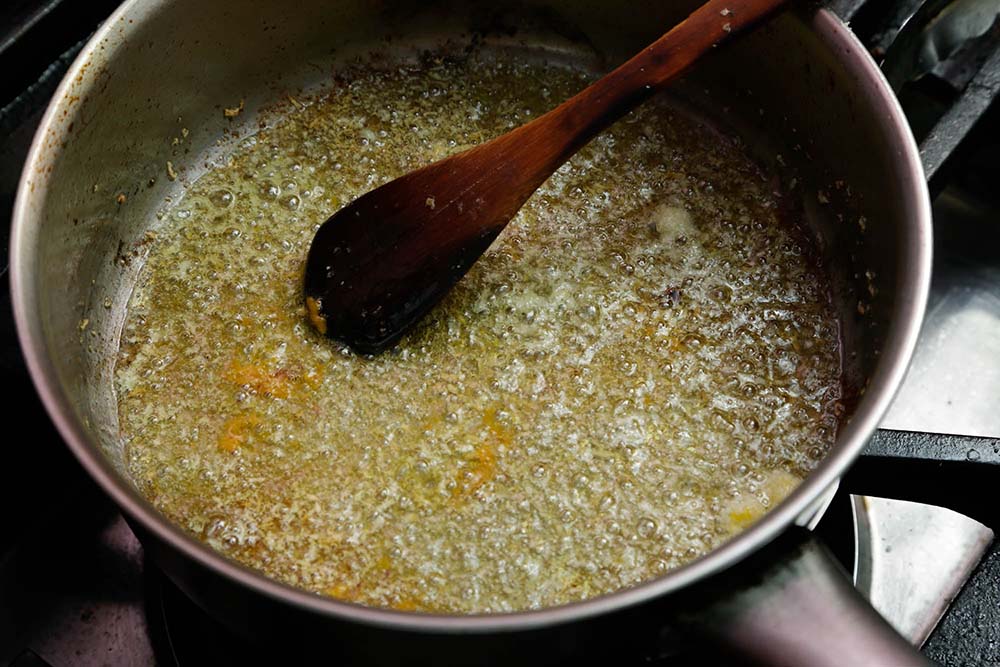 鍋に残った脂を捨て、少量鍋中に残す。オリーブ油を少量継ぎ足し、ニンニク、アヒアマリージョを炒め合わせる。