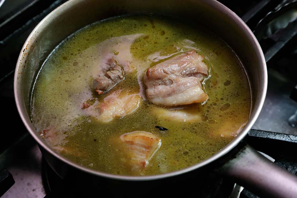 豚バラ肉は脂が多く、そのまま炊き込むと少しギトギトになります。だから一度焼き色をつけて余分な脂を落とします。ただ、焼き過ぎると硬くなるので濃い焦げ色まで付ける必要はありません。軽く焼き色が付き、豚肉からジュワジュワと脂が出てきたら引き上げて、余分な脂を捨てます。脂を少し残して香味野菜を炒めたらビールでコクをプラス。現地ではチチャ・デ・ホラというトウモロコシの醸造酒を使います。肉が軟らかくなるし、甘味とコクが出る。パクチーペーストはペースト状の香菜に塩を加えたペルーの調味料。少量加えて肉の獣臭さを消します。