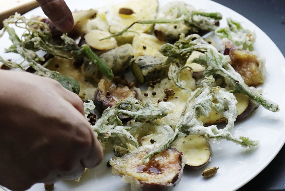 主役は市場で出合った旬の野菜。バニラ風味の衣をまとわせ、スパイス油で揚げて変わりフリットに。