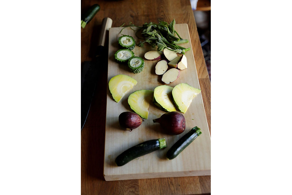 イチジクは丸ごと、ハーブ類は小房に分ける。残りの野菜は皮ごと厚さ1㎝に切る。
