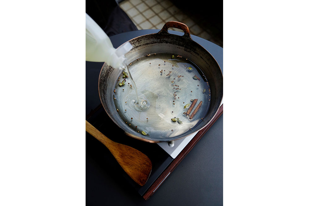 鍋にスパイス類を入れて中強火で乾煎りする。香りが立ったら揚げ油を注ぎ、中火で煮出す。