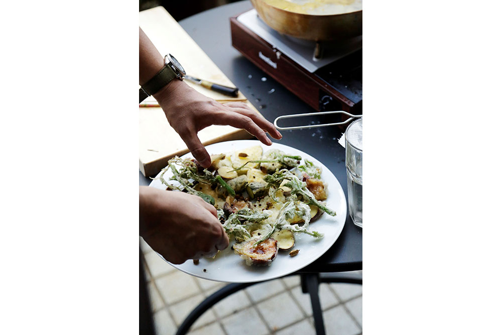 緊急事態宣言下の東京。気づけば僕はベランダや屋上で調理をしていた。家での調理の機会が増えたこの期間。レストランのテイクアウトなどだけでなく、季節の風や自然の匂いを感じながらの食事はタイムスリップした気持ちになり、新たな発見も少なくなかった。中でも意外に楽しいのが外での揚げ物。室内と違い、油はねやこもる油の香りも心配無用でストレスフリーだ。