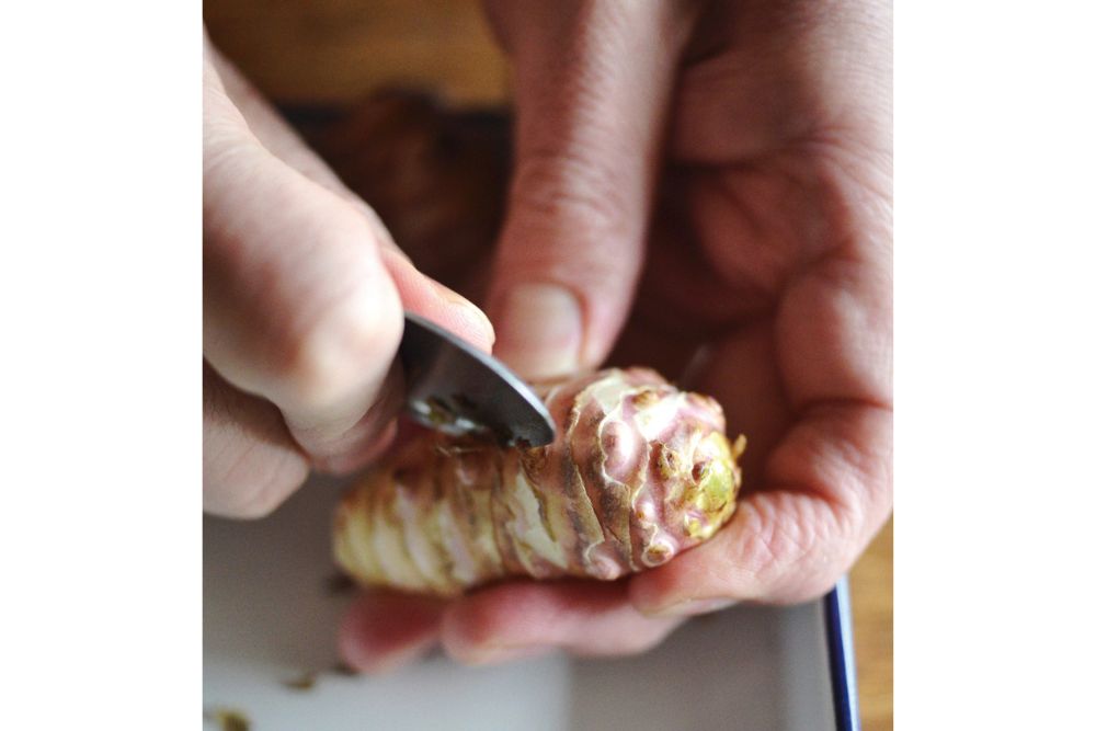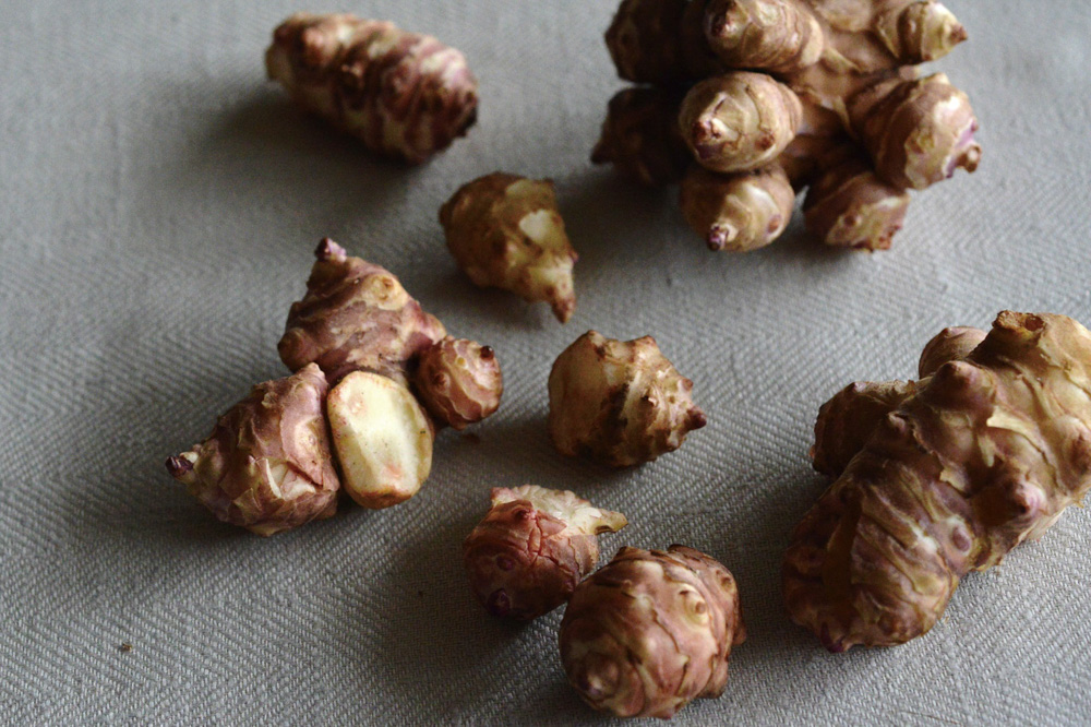 「ショウガに似ているけど、ジャガイモのような甘味とゴボウやヤーコンに似た土の香りがあります。健康に良いと人気が出て、育てやすいのもあって近頃流通が増えています。生食でき、薄くスライスすればシャクシャク。味噌漬けも美味。煮込めばトロリとした食感に。保存は、土の中に埋めるのが一番ですが、一定温度以上になると芽が出てしまうので、新聞紙に包んで野菜室へ」