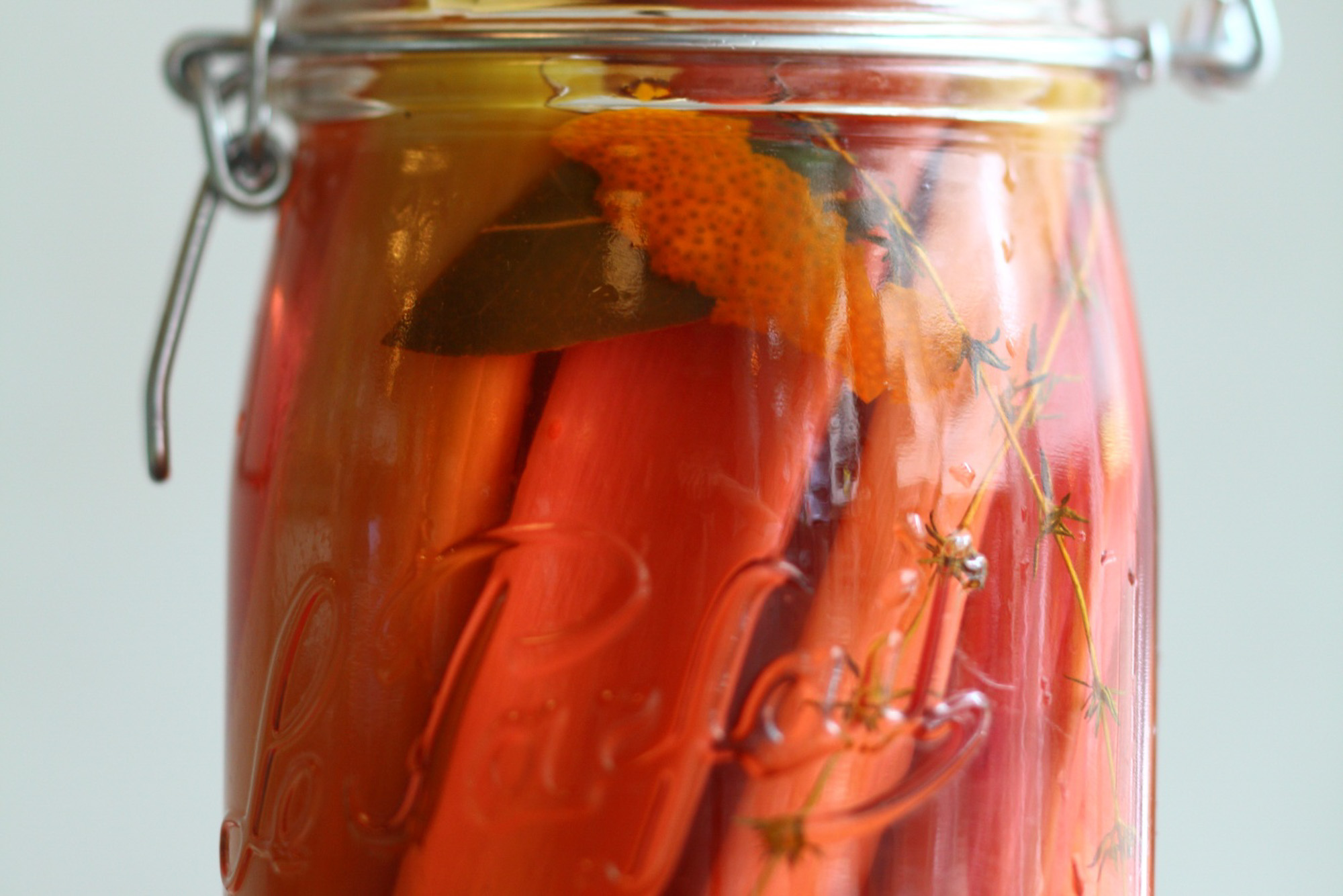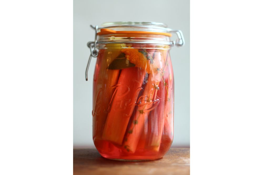 瓶にリュバーブを詰めて、リュバーブが完全にかぶるまで、シロップを注ぎ入れる。