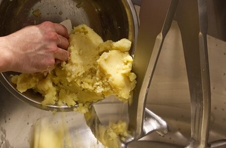 ブリオッシュらしいしなやかな生地の伸びを作るのは、茹でてマッシュしたポテト。ジャガイモは、ドイツ語でFestkochend(フェストコッヘンド・硬めに茹であがる)ねっとり系を選び、水から皮ごと茹でて甘味を引き出し、軽く潰す。