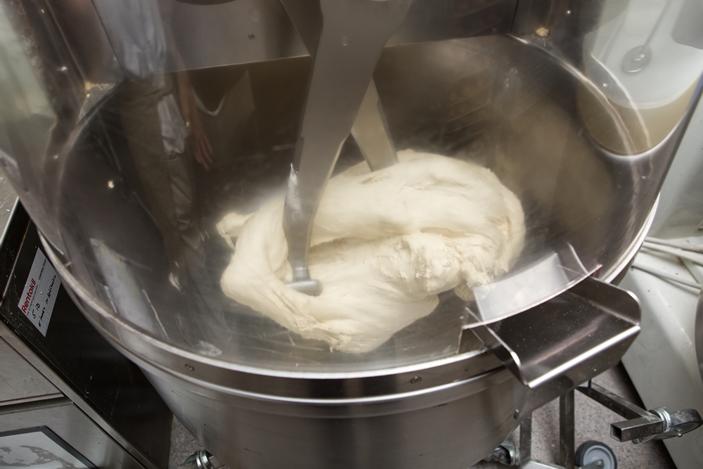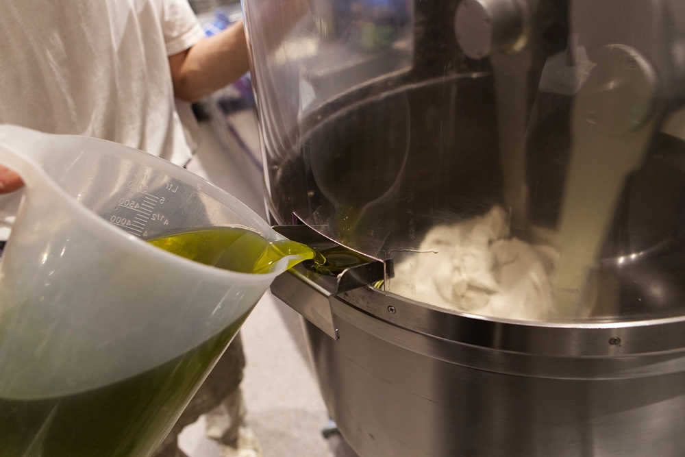 生地にはたっぷりのE.V.オリーブ油を使う。たっぷり混ぜ込むため生地に染み込むように混ぜる前には30分生地を休ませる。油の味が前に出過ぎないよう、E.V.オリーブ油はマイルドな味わいのものを選ぶ。