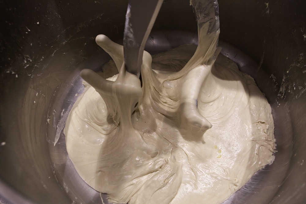 ミキサーボウルにオリーブ油以外の材料を全て入れ、撹拌する。低速で5分、次に高速で10分回す。※低速と高速、2段変速ミキサーを使用。