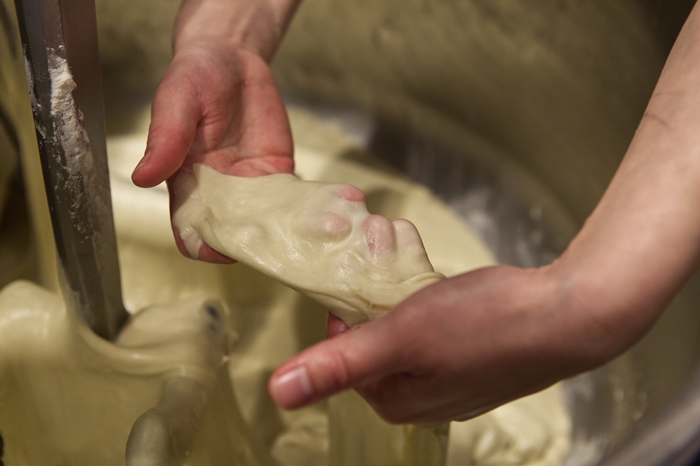 通常は卵とバターのリッチな風味が特徴のブリオッシュのレシピにも、様々な工夫がある。小麦粉はグルテン形成力が強い「Backstark(バックシュタルク)」タイプのものを使用。ふわふわと柔らかく、伸びのいい生地の秘密は、マッシュしたジャガイモだ。またオリーブオイルをリッチに使っているが、量が多いので、最初はオイルを加えずに生地を作って一旦休ませてから、30分ほどかけて、少量ずつ生地に馴染ませるようにオリーブオイルを加えていく。
