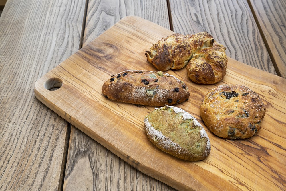 「山椒と菊芋 」、「七味とわかめ」、「よもぎとレモン」、 「チョコミントパタート」。大豆由来のため、だしを煮含ませたワカメや、ユズ七味、山椒などの和の香辛料、ヨモギなどの和素材も難なく受け止める。日本人好みの練り込みパンも展開が可能だ。
