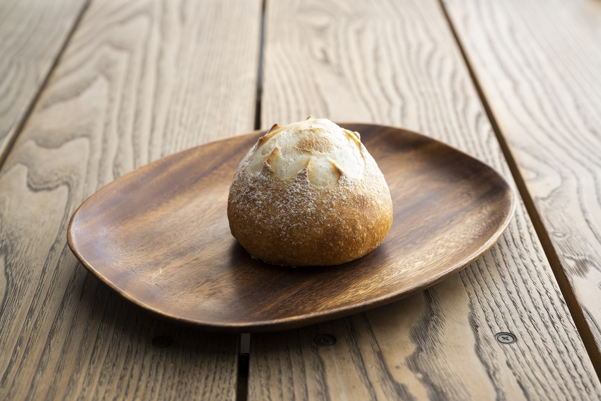 国産小麦のハルユタカ100%。大豆由来のバター「ソイレブール」をフランスパン生地に10%練り込むことで、同じ豆製品である豆腐や味噌、醤油の風味と響き合う。日本人の味覚に合わないはずがない。国産小麦に藻塩と、素材も国産に。外はパリパリ、中はふんわり、もっちり。アレンジにも山椒や七味が合う。融点が低い油脂なので冷蔵しても硬くならない。