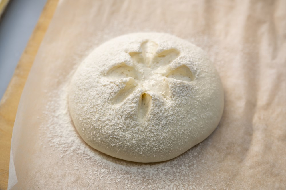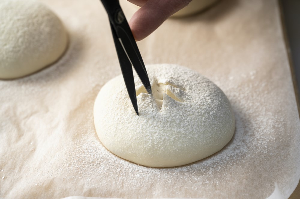 表面にしっかり打ち粉を振り、ハサミで中央を8つまみほどカットする。