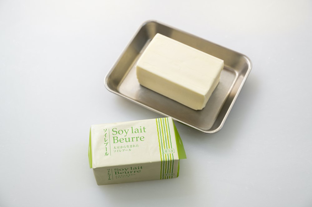 原料は、植物油脂、豆乳クリーム、豆乳、大豆粉、食塩。世界初の特許製法で作られた豆乳クリームを使用してバターのように仕上げたもので、原料の60%以上が大豆由来。動物性原料不使用なので、乳製品アレルギーにも対応できる。バターと比較して、トランス脂肪酸が約50%オフ、コレステロールが約97%オフ。大豆のコクや風味も強く出過ぎず、合わせる素材の風味を引き立てる。すっきりした後口も特徴。