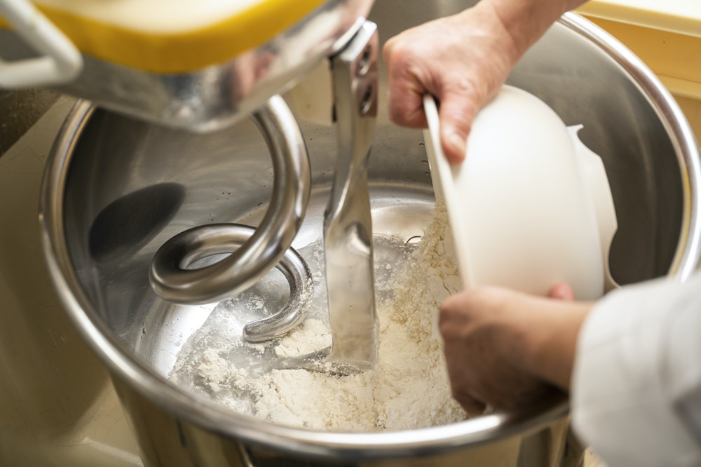 ミキサーボウルに水と粉を入れて低速で回し、粉気がなくなったらイーストを投入。低速で3分ほど回して混ぜる。