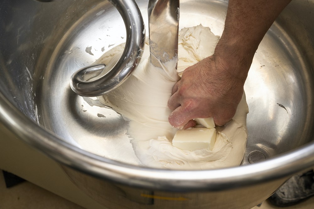 生地ミキサーを低速で1~3分程度回して塩を加える。さらに5分ほど回す。光沢が出て薄く伸ばせるようになったら終了。