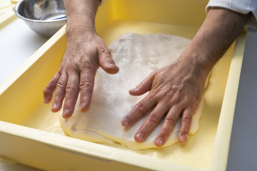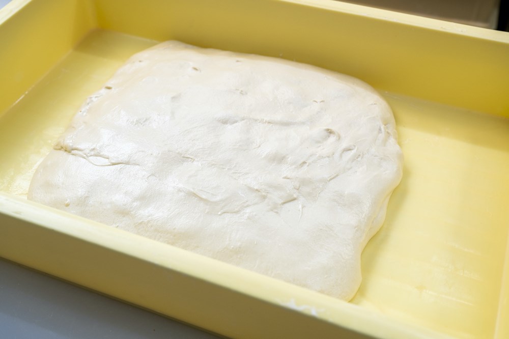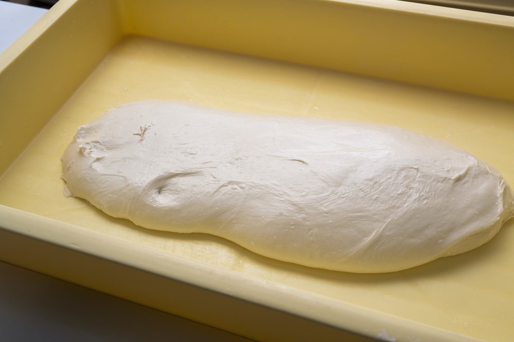 バンジュウに蓋をし、冷蔵庫(5℃)で12時間以上発酵させる。冷蔵庫から生地を出し、1時間程度置いて室温(25℃)に戻す。