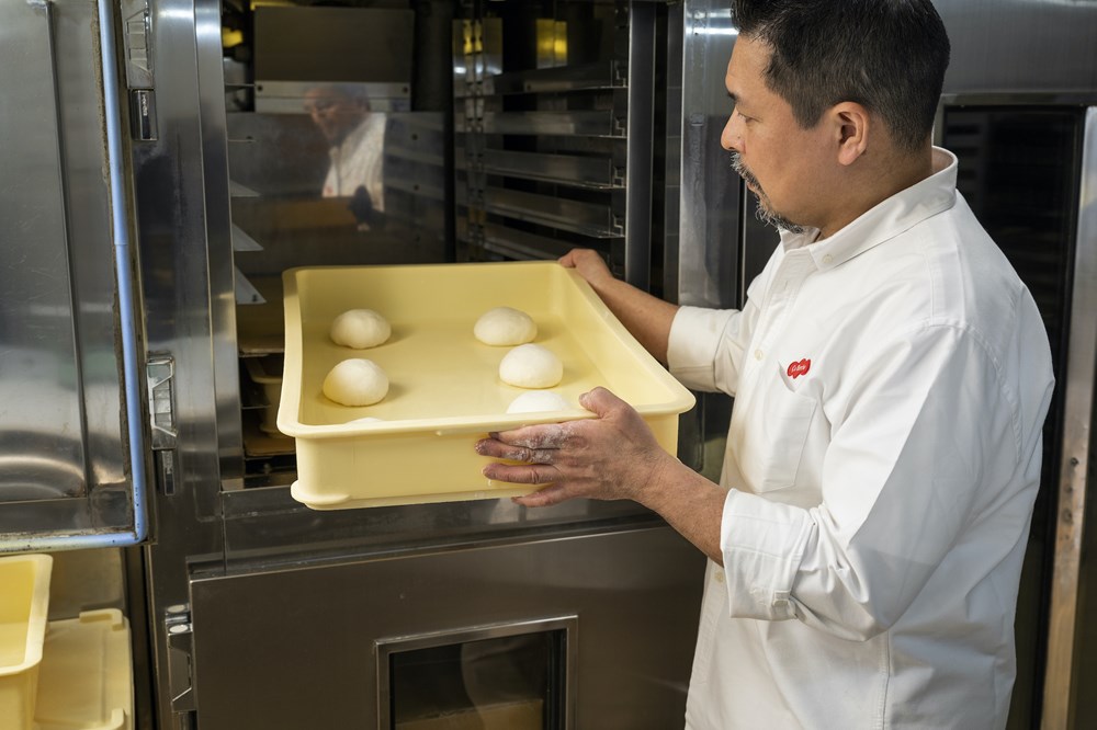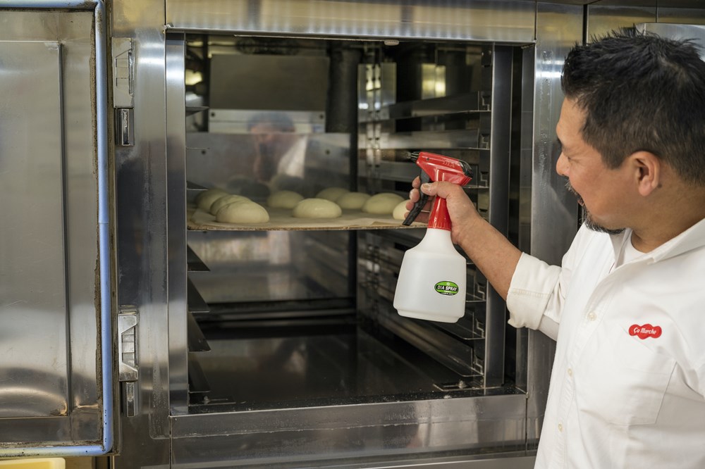 パンの表面に霧を吹き、30℃・湿度70%のホイロに入れ、30~40分発酵させる。