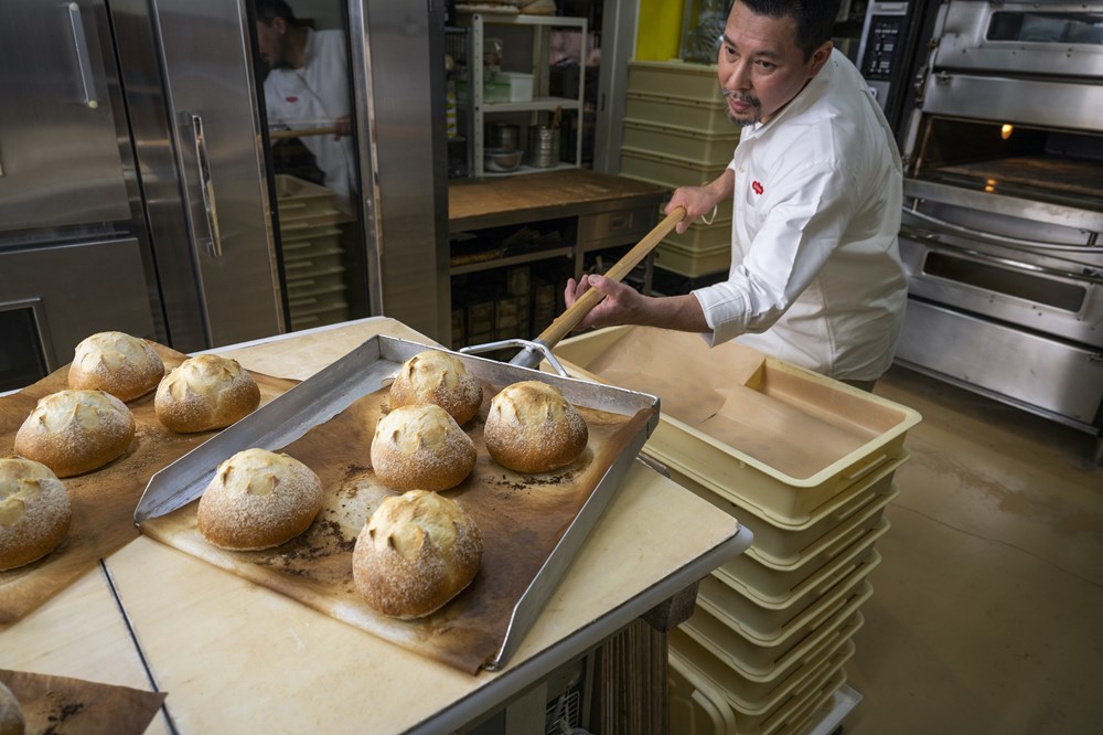 果物を使った華やかなデニッシュで「コム・シノワ」を全国的に有名にした西川功晃さん。自店を開いてからも、米粉やゴマ油を使ったパンや低糖質パンなど、時代に先駆けたパン作りに邁進する中、2005 年のリニューアル以後は一人でパンを焼く。「作業性や利益を考えず、絶対だと思うパンだけを作る。ベーシックなパンも全て配合を変えた」