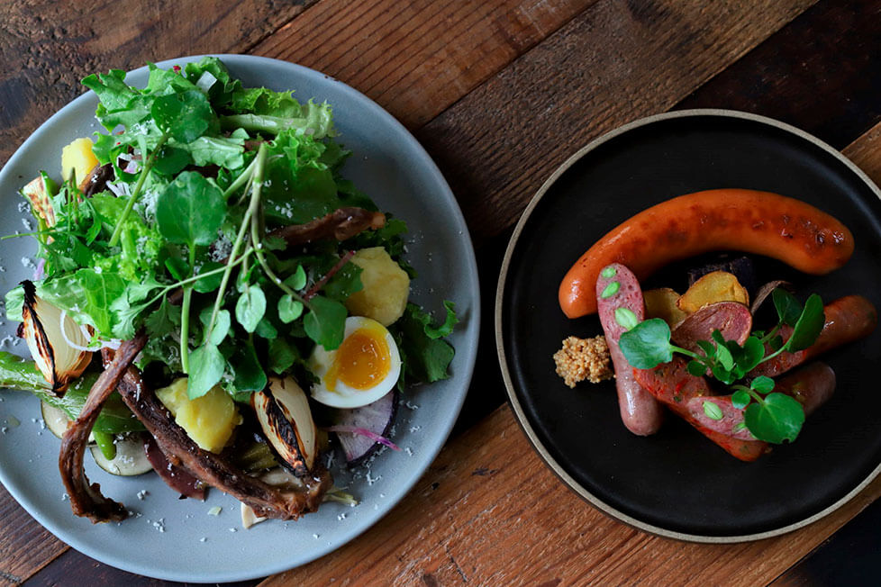 TOP写真:サラダには採れたての野菜、生みたての卵、猟師が仕留めたイノシシのスペアリブが。イノシシ肉で作るソーセージは枝豆などの野菜入り。ジャガイモやマスタードを添えて。