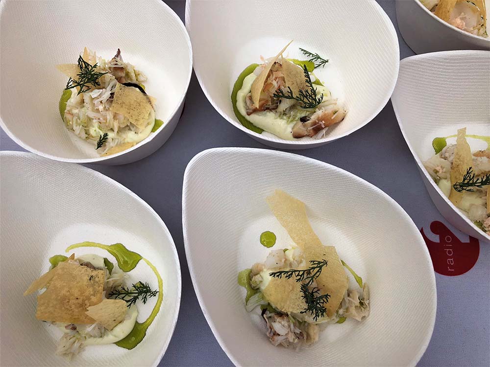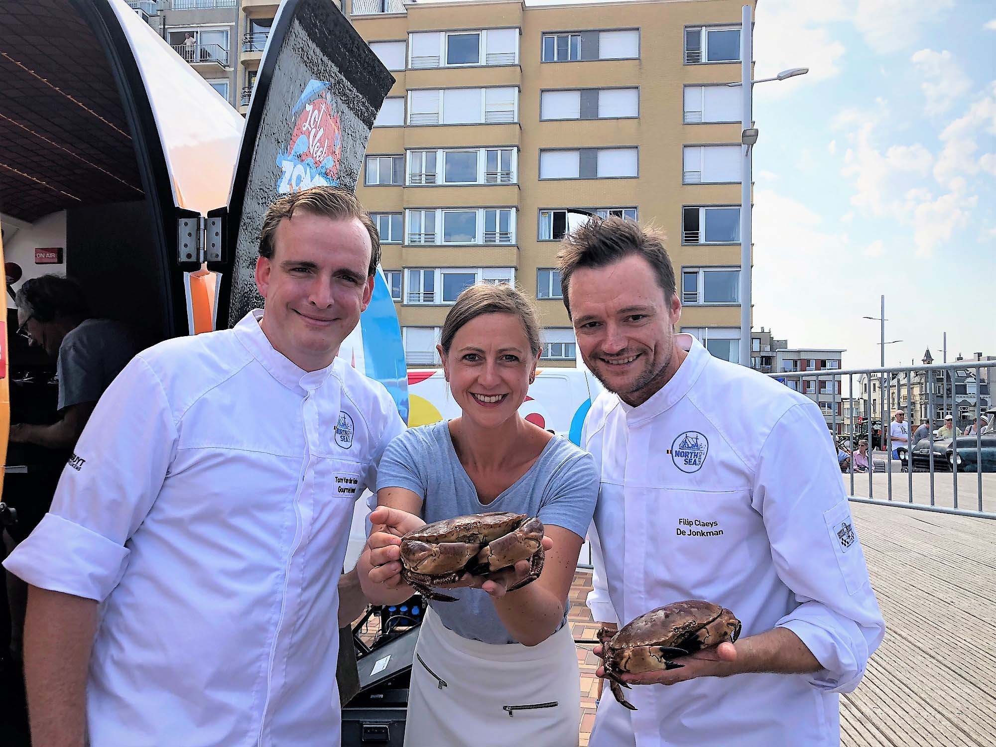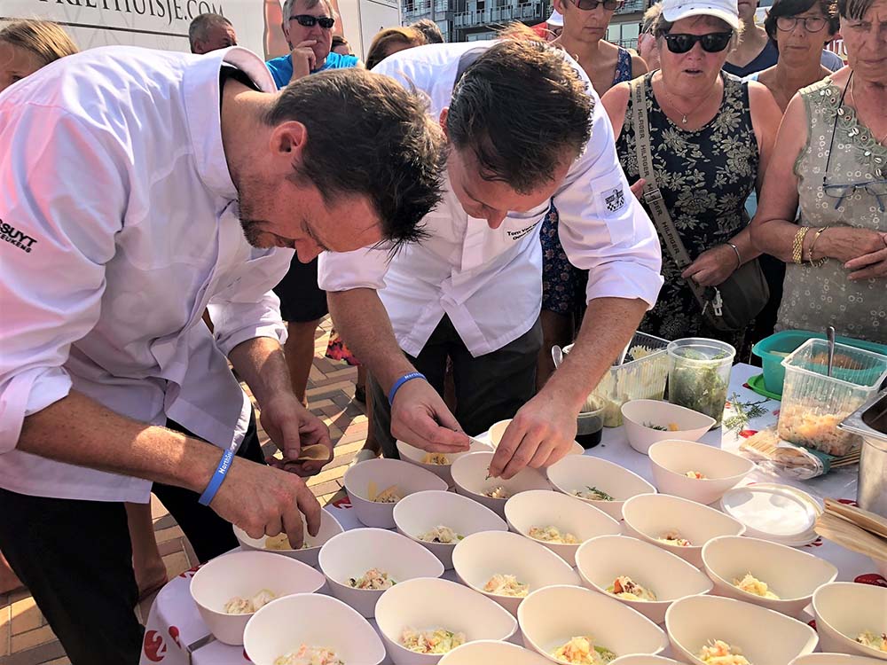 本日の水揚げされた魚介の主役はカニだった。捕れたてのカニのほぐし身とジャガイモのピュレに、ディルなどのハーブを散らして、オリーブオイルをかけた料理が、観客に行き渡る。フレッシュなカニの甘味と温かなジャガイモのマリアージュを楽しんでいる観客から、「北海シェフ協会の取り組みを知っている」という声もあがった。様々なメディアからの発信もあり、ベルギーの一般の人々にすでに知られてきているのだ。また、バカンスをビーチで過ごす人々にとって、ビーチクリーンイベントにも参加する北海シェフ協会の活動は関心の的と言っていい。