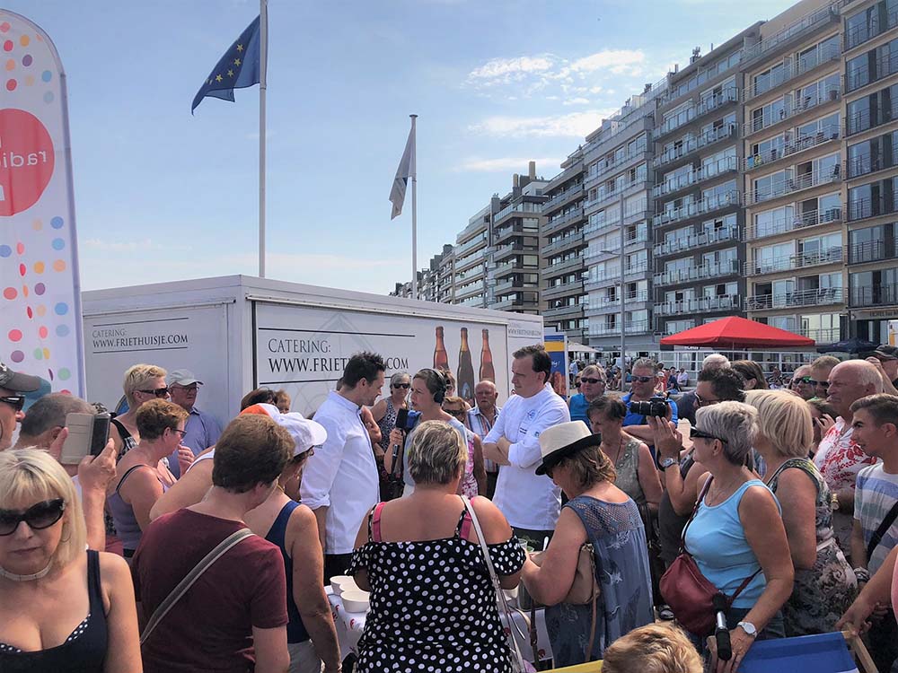 「ラジオ2」の仮設ラジオ局には、早朝からすでにたくさんのビーチ客が集まっていた。クライスさん、そして、北海シェフ協会メンバーでゲント市にある「グルメ・インヴェント」シェフ、トム・ヴァン・デル・エッケンさんが、運んできた食材で料理を始めている。クライスさんは必ず毎回メンバーの一人を伴って、彼らのレストランの紹介もしている。