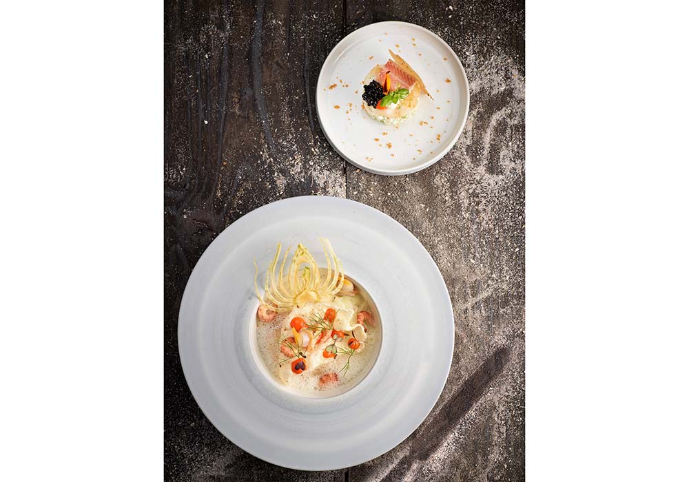 下がメインの温製の皿。カリッと歯応えの良いアンコウのフライは、予めカレー風味にマリネしてある。ドライにした薄切りのウイキョウのパリパリとした食感、エキゾチックなタイ風スープが、アンコウをさらに引立てる。上は冷製の付け合わせ。アンコウはカルパッチョにしてウナギと和え、ジャガイモのマセドワーヌサラダの上にのせた。