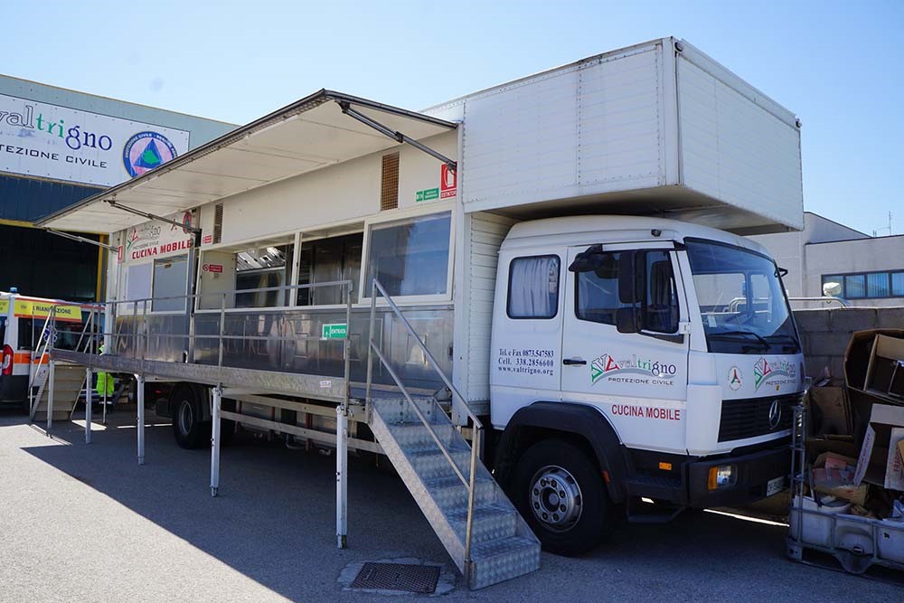 イタリアでは被災初日からトイレ付きのキッチンカーが出動。シェフが作る温かい料理が配られる。