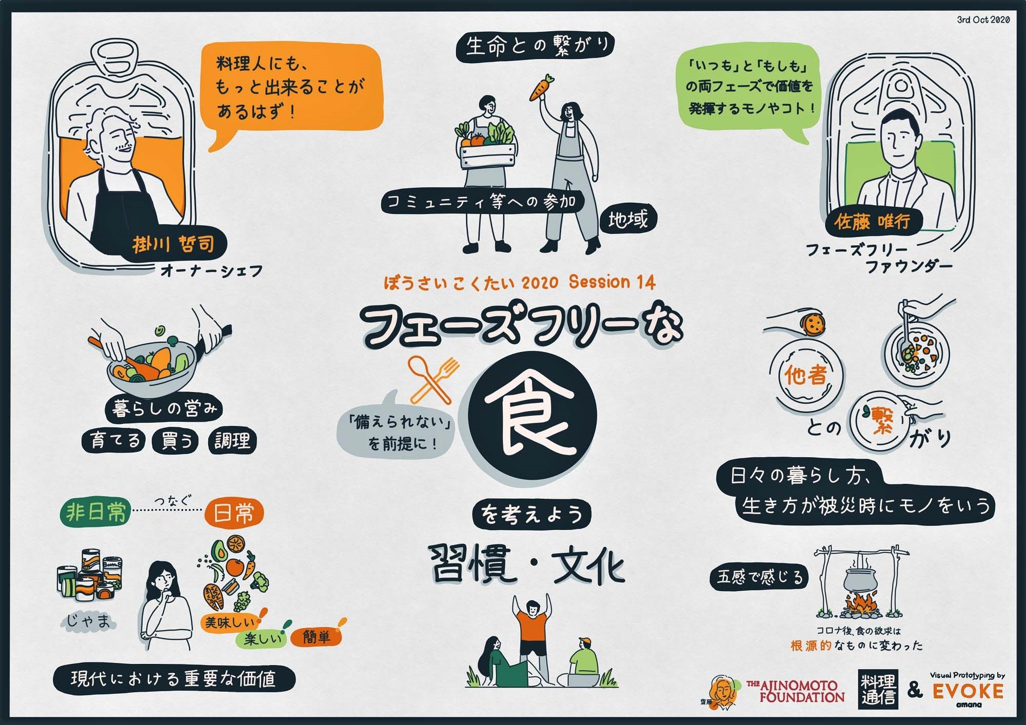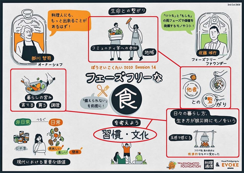齋藤:フェーズフリーな食の根本にあるのは、人とのコミュニケーションや一人ひとりの食習慣という、とてもベーシックな価値観という気がします。食は人を繋ぎますが、知っている人が知らない人に伝える、考えられる人が動ける人と結びつく、互いに支え合う。日常でも災害時でも変わらず食に求めるものは何か、豊かさとは何か。考え続ける先に、一人ひとりのフェーズフリーな食が見えてくるのかもしれませんね。