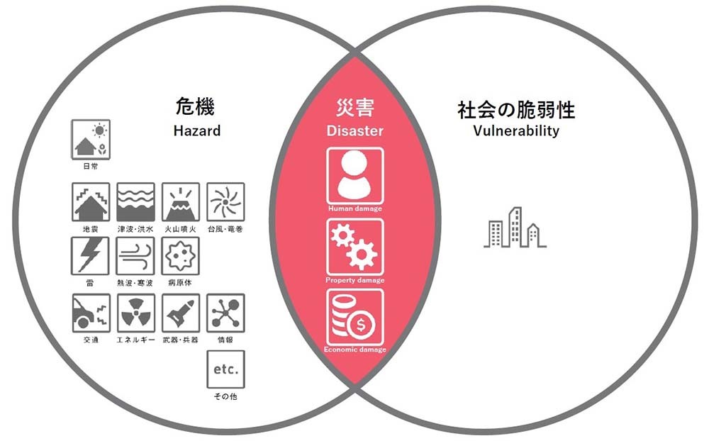 佐藤:災害は突然発生する“危機”と、社会の“脆弱性”が重なった時に起こります。たとえば、震度7の地震という危機は砂漠の中で起きても災害にはならないけれど、脆弱な都市で起こるからガラスが割れたり停電が起きたりして“災害”になる。突然起こる危機を回避したり、コントロールすることは難しいけれど、脆弱性を小さくすることはできます。その脆弱性は、災害時に突然現れるものではなく、普段から一人ひとりの暮らしの中に存在しているからです。