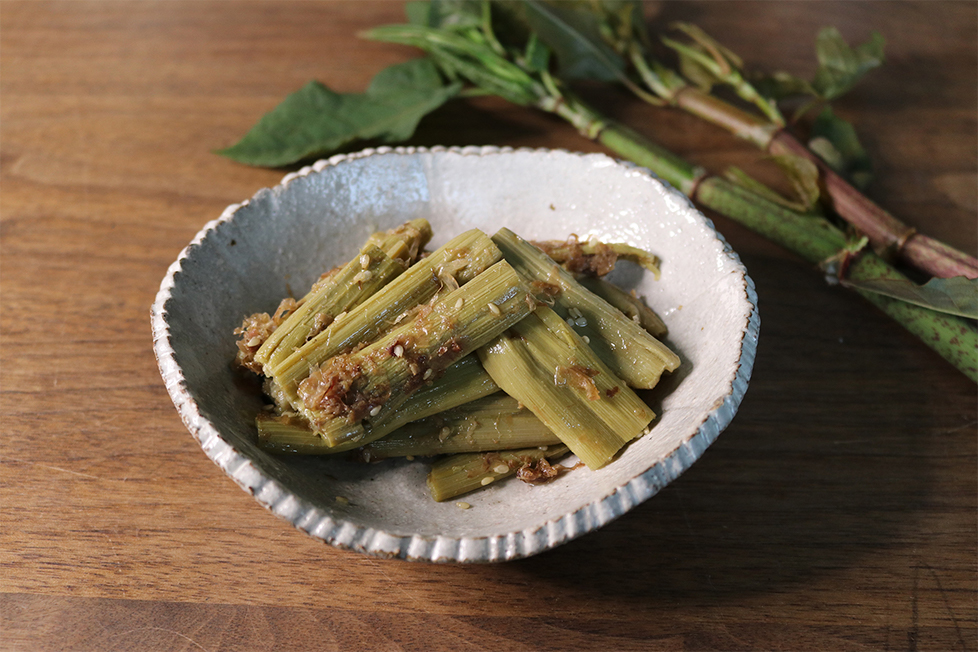 高知県でイタドリを使った料理の定番は「油炒め」。イタドリは油と相性がいい山菜なのだ。アク抜きしたイタドリ(300g程度)を大さじ1のごま油でさっと炒める。砂糖大さじ1、醤油大さじ2、かつお節をたっぷり加えてさらに炒めて味をなじませ、お好みで白ゴマをふる。下茹でしているので、手早く炒めるのがコツ。