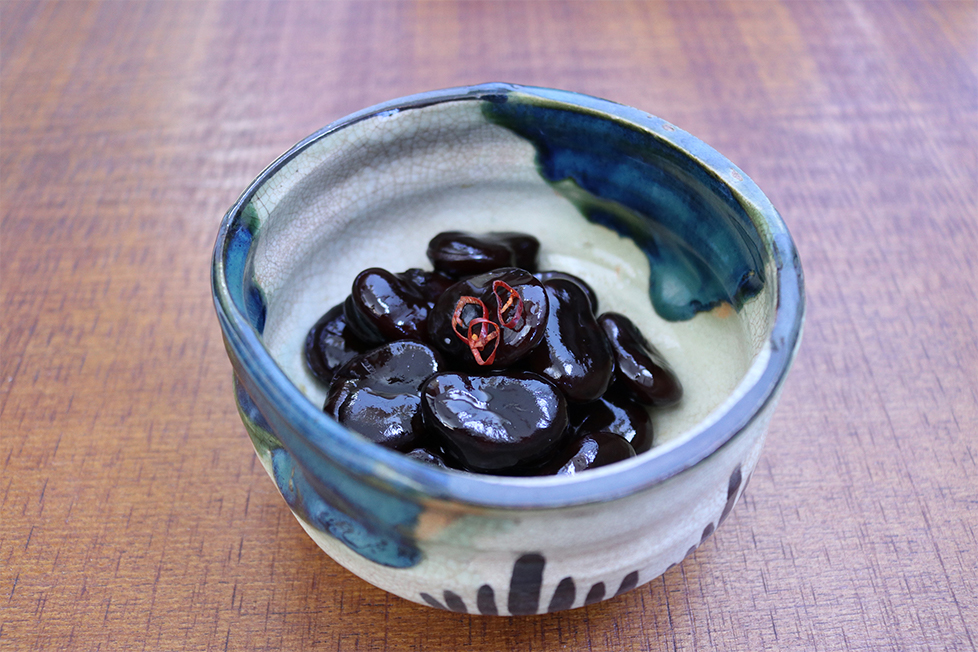 「煮豆と違い、戻したり、大量の水で下茹でしたり、アク抜きする時間が不要です。基本の材料は乾燥ソラマメ、砂糖、醤油、みりん、保存性を高めるために唐辛子を加えます。ポイントを押さえればシンプルな調理法なので、誰でも作れるレシピですよ」