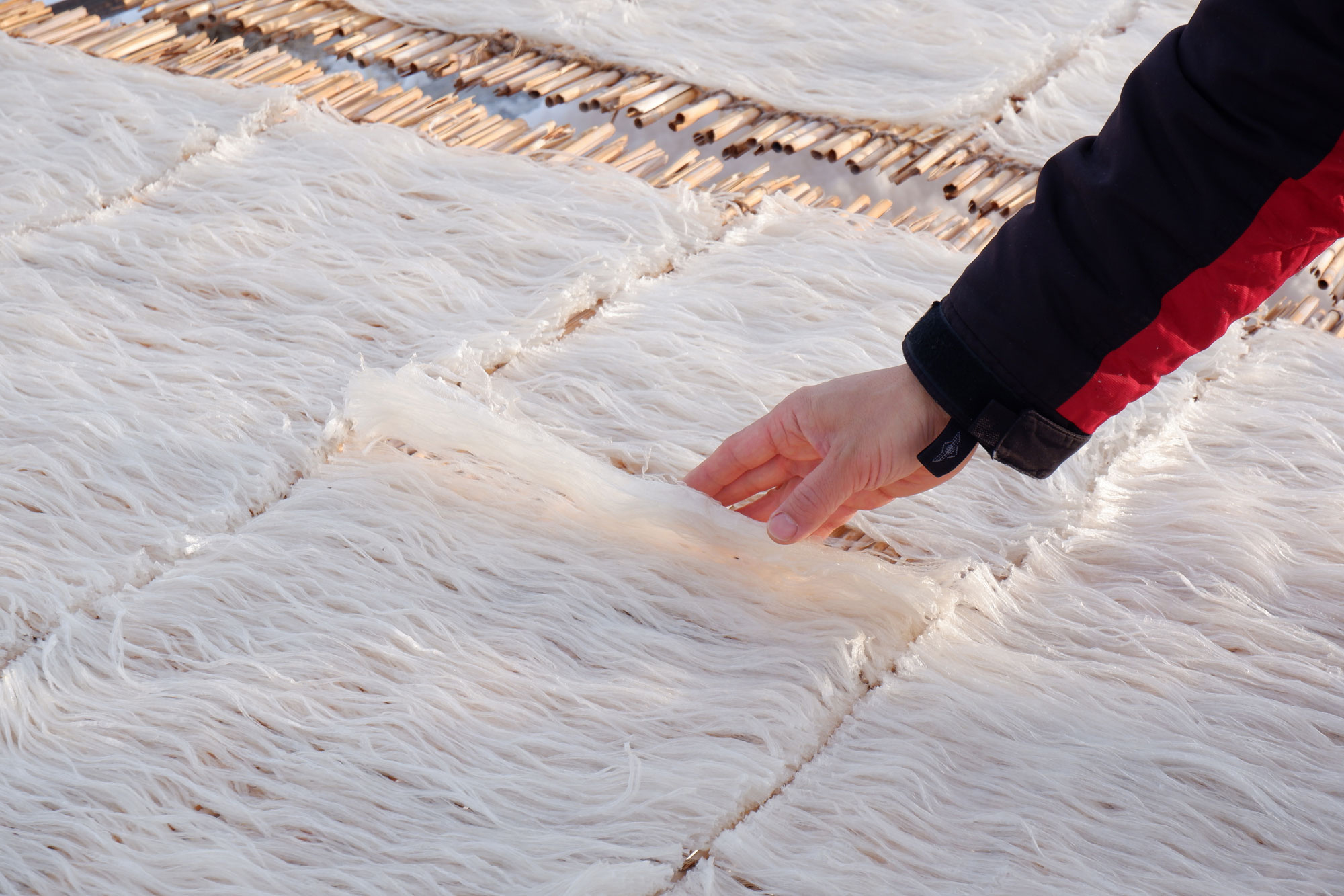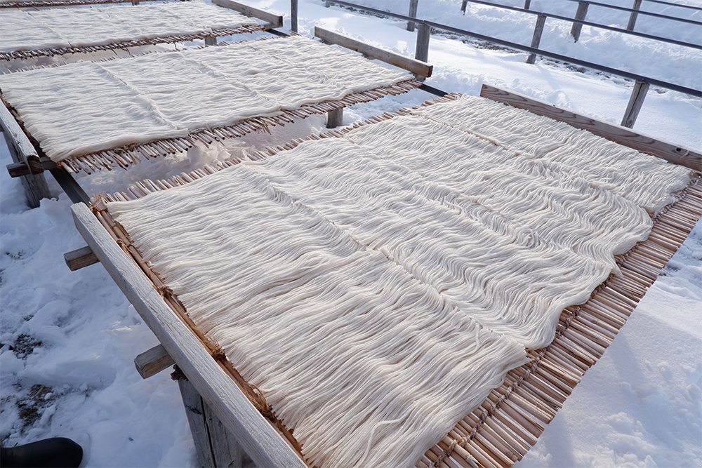 外気で凍らせ、日光と風で凍結乾燥させる工程を約2週間繰り返し、輝くような白色になったら完成。