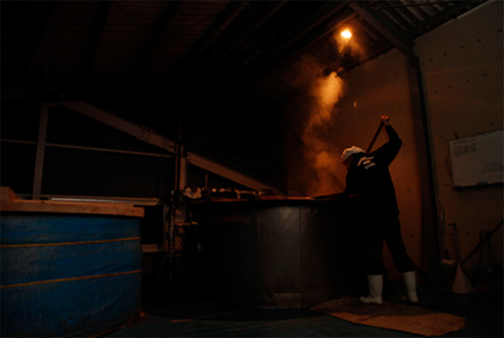 天草を煮る。小笠原商店では、直径約3メートルの大釜で煮る。わずかな加減が品質を左右する職人の領域。photograph by Ogasawara shoten