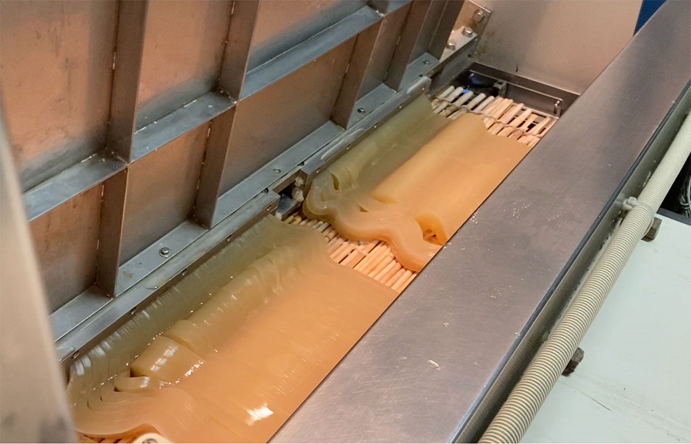 煮上がった寒天は一晩蒸らして漉し、絞り固めて太めのところてんを作る要領で突き出す。写真は、機械で突き出された、乾燥前の寒天(ところてん)。淡い黄色味を帯びている。