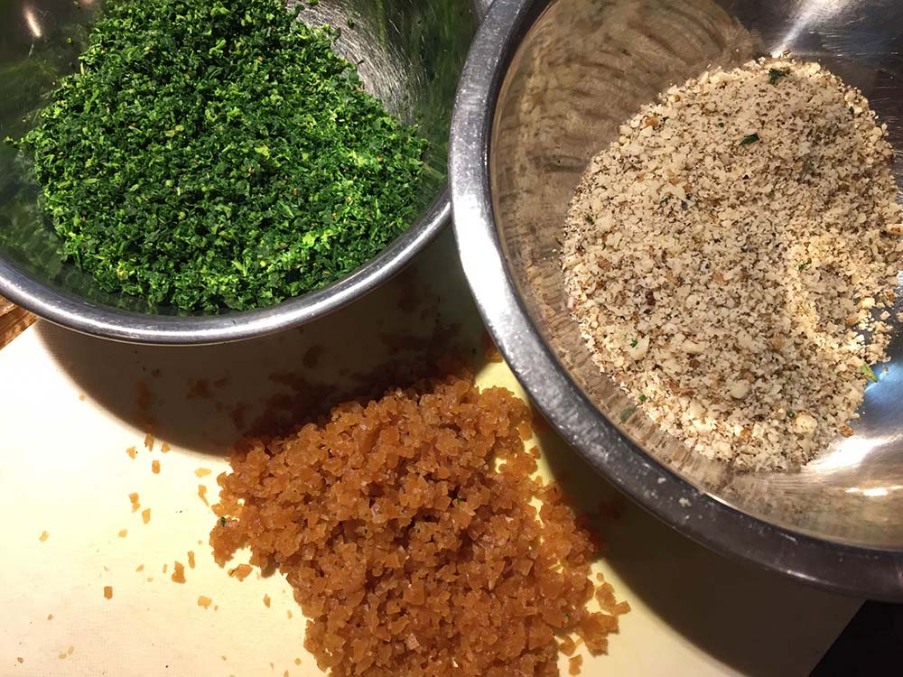 細かく刻んだウコギ、ヤマグルミ、味噌漬け大根。盛岡の「ほろほろ好き」は、刻む苦労を厭わない。