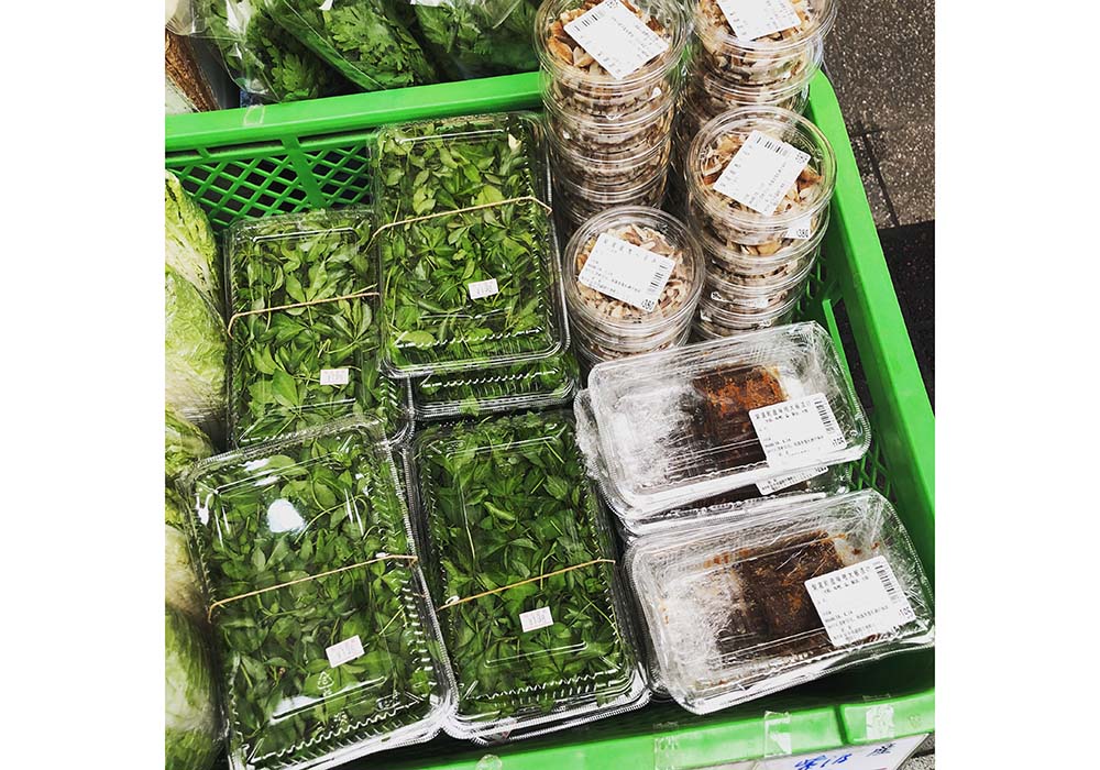 産直などでは、ウコギとその隣にクルミと味噌漬け大根を一緒に陳列して販売している。