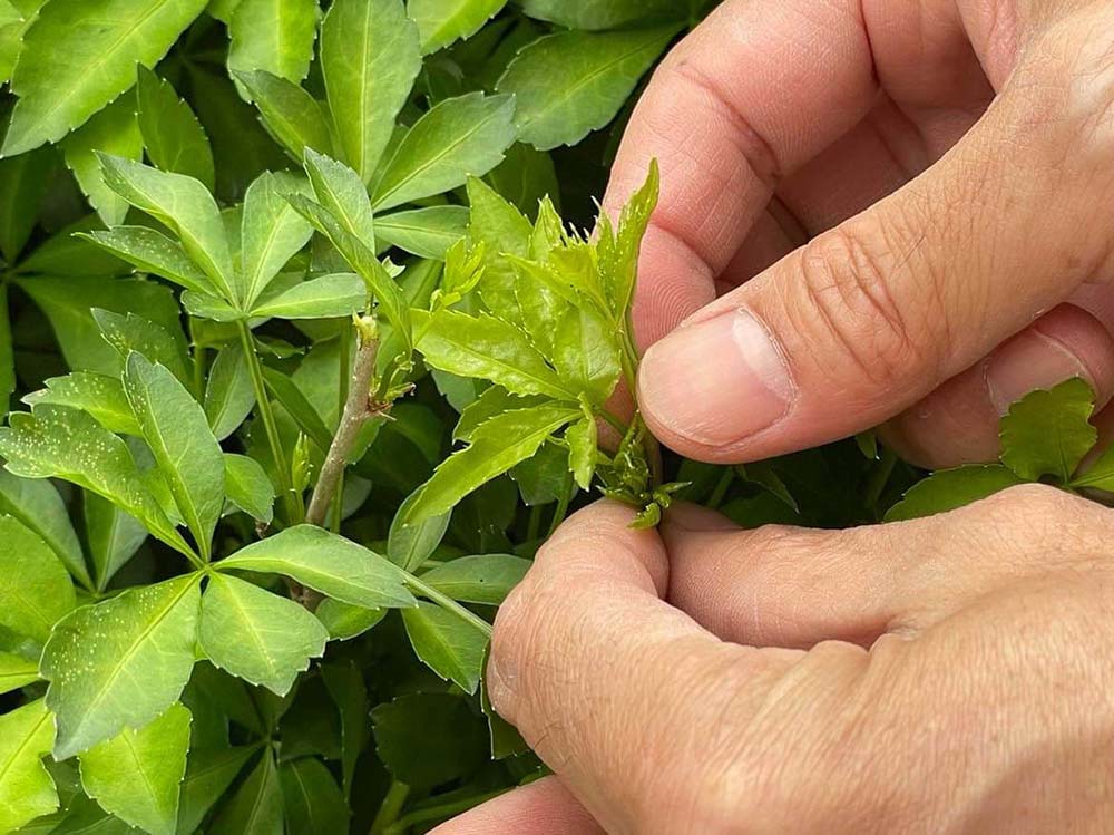 ウコギの木(写真上)と若芽(写真下)。葉の付け根にトゲがあるので、若芽を摘むときには要注意。