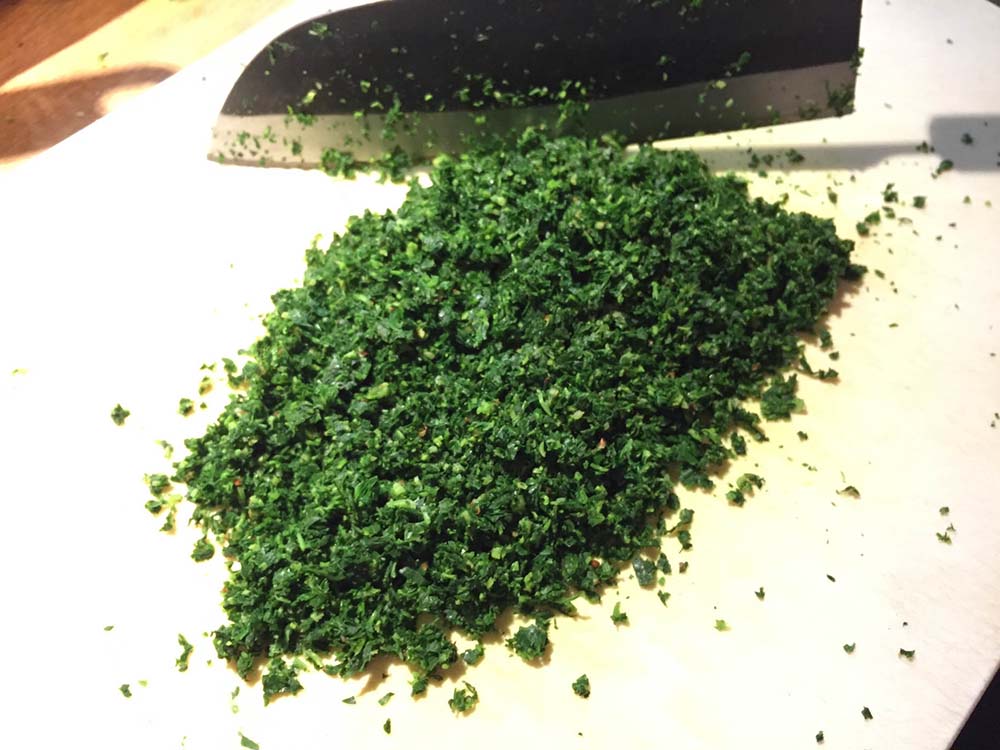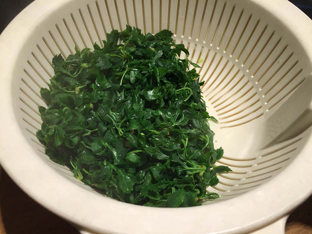 茹でたウコギは水にとらずにザルの上で自然に冷まし、水分をしっかり絞って細かく刻む。