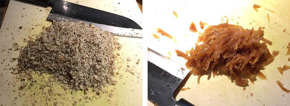 ヤマグルミは殻を割って実を出し、細かく刻む。味噌漬け大根は、スライスしてキッチンペーパーで水気を取ってから細かく刻む。