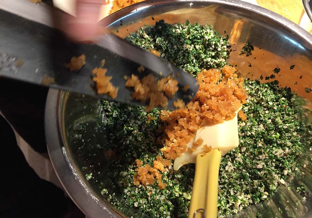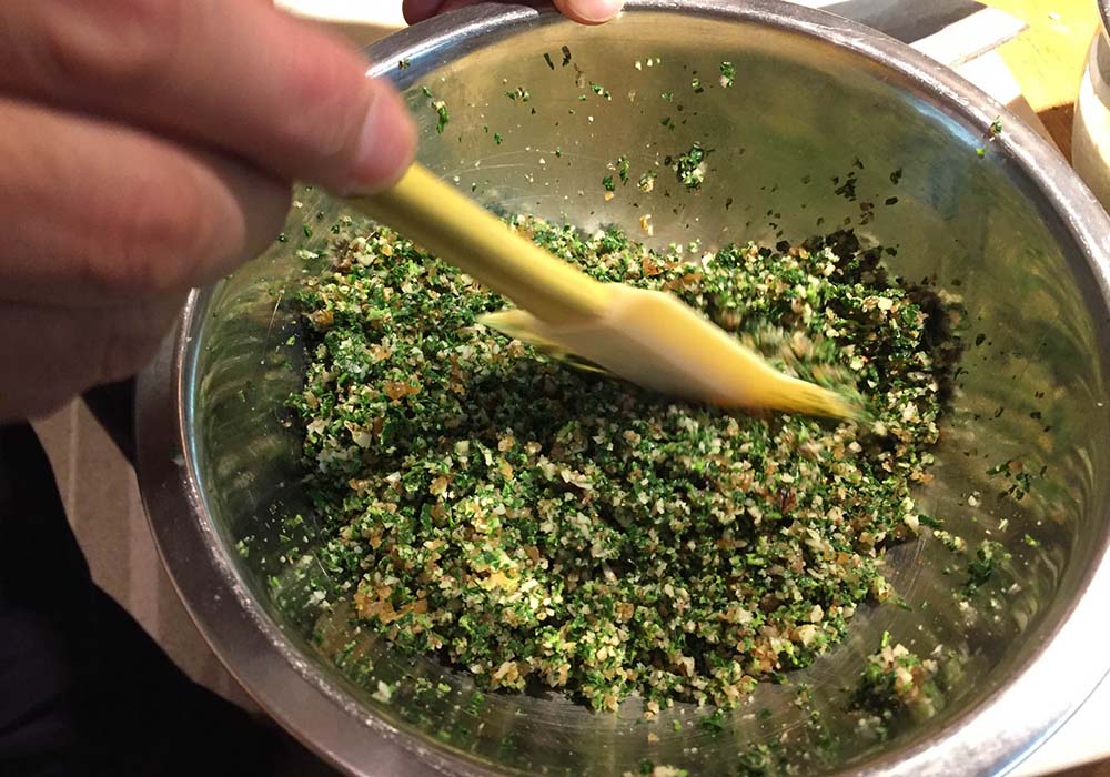 ボウルにウコギとヤマグルミを入れて混ぜ合わせ、味をみながら味噌漬け大根を加える。
