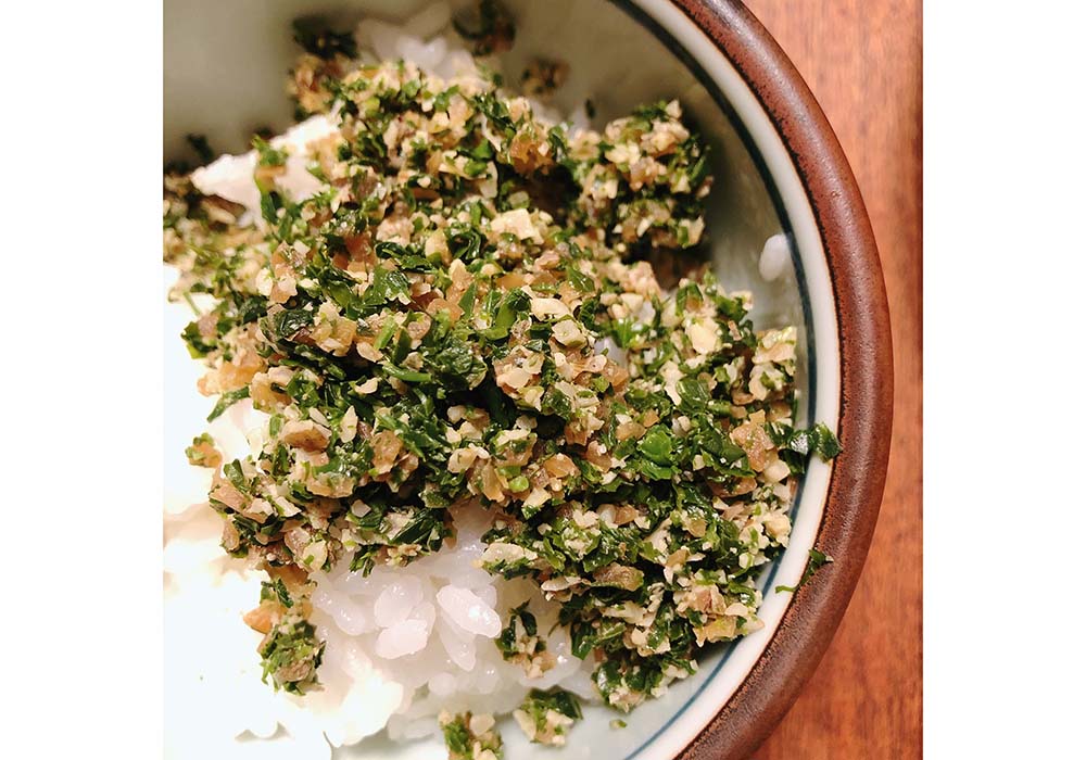 そんな「ウコギのほろほろ」を愛してやまない盛岡市民のひとりが、グラフィックデザイナーの小笠原一志さんだ。昭和42年に市内の中心街で生まれた小笠原さんは、子どもの頃から祖母や母親が作る「ウコギのほろほろ」が大好物で、学生時代にはご飯に混ぜ込んだおにぎりを弁当に持って行ったほど。「私が育った地域ではウコギを『オグギ』と呼んでいましたが、今ではもう通じないですね。当時の家には庭がなかったので、祖母や母親は、野菜の行商の女性からオグギを買っていました」